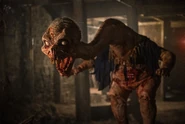 Back in the living room, Kelly continues her own fight against Ruby, though she is outnumbered due to the Demon Spawn, who grab her and pin her to the cabin's ceiling before letting her drop to the floor.