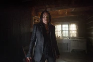 As Henrietta focuses on the girl, Ash uses his shotgun to blow the lock and chains off the fruit cellar's door, scrambling back up to the cabin's den. As he waits for Knowby's inevitable attack, the cabin door opens, where in walks a blonde Ruby holding the blood-covered Ex-Mortis. Recognizing Ash as the "Hero From The Sky" written of in the Necronomicon, the bewildered Ruby watches as Henrietta throws open the cellar door and pulls Ash back into the basement. Just as the door slams back shut, the pink-haired Ruby and Kelly Maxwell arrive at the cabin, shocked to see The Dark One's younger counterpart there. As the noise of Ash and Henrietta's battle reaches up to the living room above, Kelly makes a dash for the cellar door, only for the blonde Ruby to throw her across the room, disgusted that her older-self is now partnered with The Promised One.