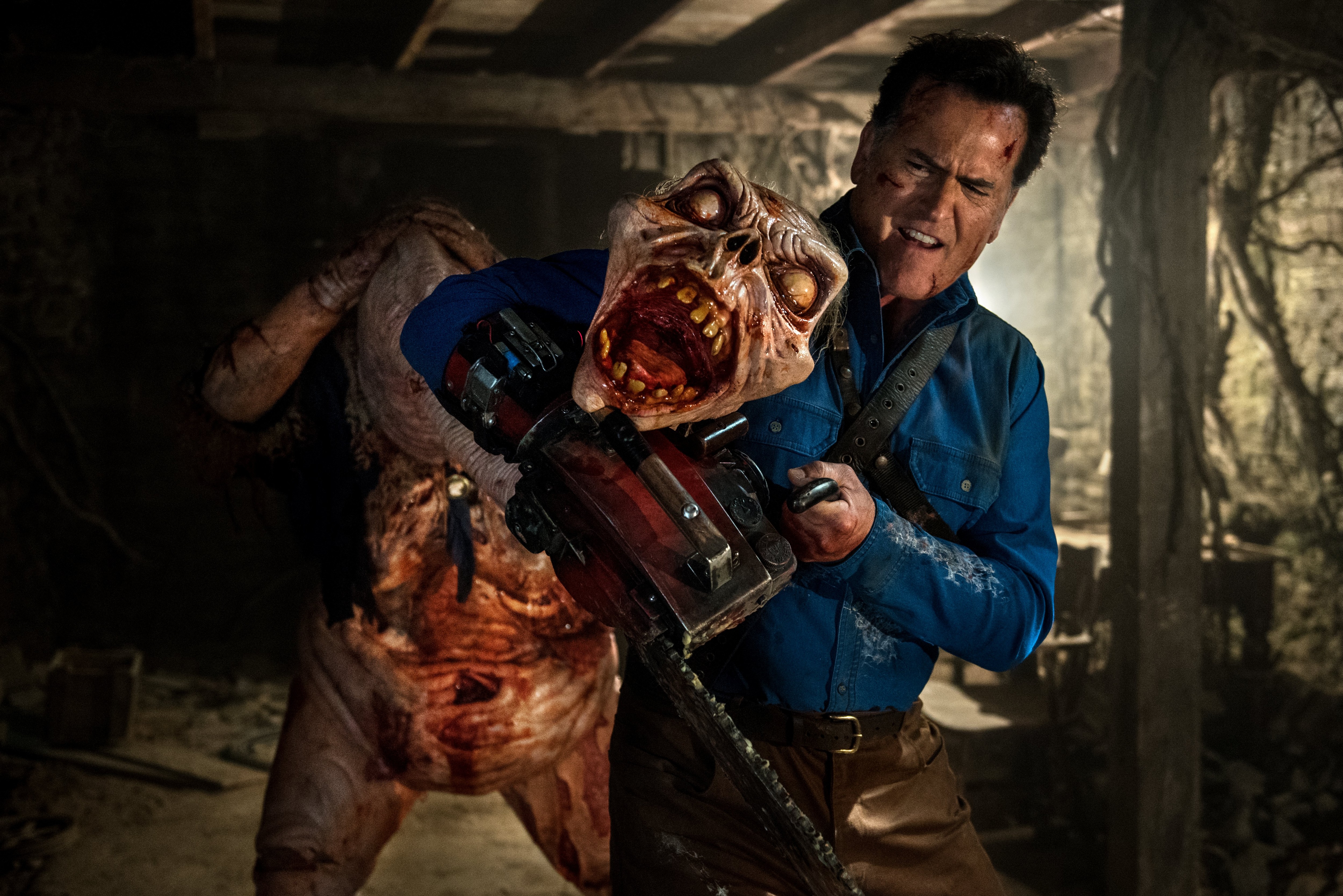 Below the cabin, Ash and Henrietta's battle grows more intense with every block and punch. Eventually, Henrietta mutates into her "gooseneck" form, using her long neck to lunge at Ash from across the room. After a failed belly-flop onto Williams, Ash manages to start up his chainsaw, and pins-down Knowby as he slices off her head.