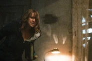 Upstairs, Kelly tries her hardest to get the cellar door to open, doing everything from shooting it with her machine gun, and then taking several swings at it with an axe. Meanwhile, Heather begins to succumb to the cabin's illusions, seeing blood bubble up from Kelly's bullet holes in the floor, followed by roaches crawling all over her body. Kelly slaps Heather and tells her that she needs to get ahold of herself, and help her help Ash and Pablo. Having grown tired of her attacks, the cabin itself forces Kelly into the thunderstorm outside, leaving Heather all alone inside.